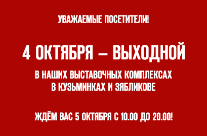 Обращаем ваше внимание, что 4 октября наши выставочные комплексы в Кузьминках и Зябликове не работают.