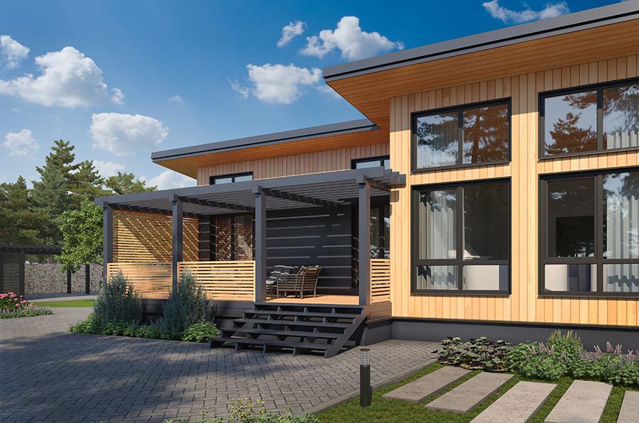 Особенности серии: панорамные окна, второй свет и пергола.