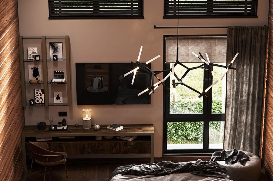 Отделка спальни в тёплых древесных тонах настраивает на спокойный сон. Главная спальня объединена с тремя другими комнатами дома в единый блок — с общей ванной в холле.