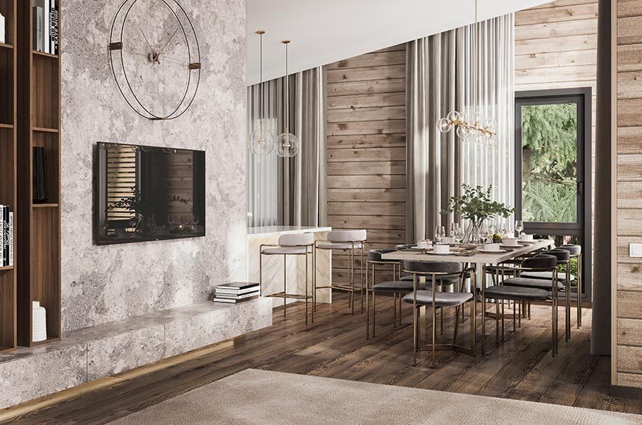 Стулья в тканевой обивке и древесно-зелёная палитра добавляют интерьеру благородной роскоши. А панорамные окна и второй свет делают столовую максимально просторной.