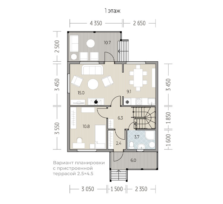 Особенность серии: полноразмерный второй этаж без мансардных скосов кровли, за счёт чего в комнатах можно разместить любую мебель. Дополнительно доступна пристройка террасы.