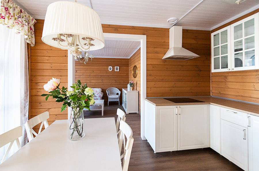 Белые матовые фасады с классической фрезеровкой гармонично сочетаются с деревянной отделкой и придают интерьеру современный облик. Гарнитур может быть прямым или Г-образным в зависимости от планировки помещения.