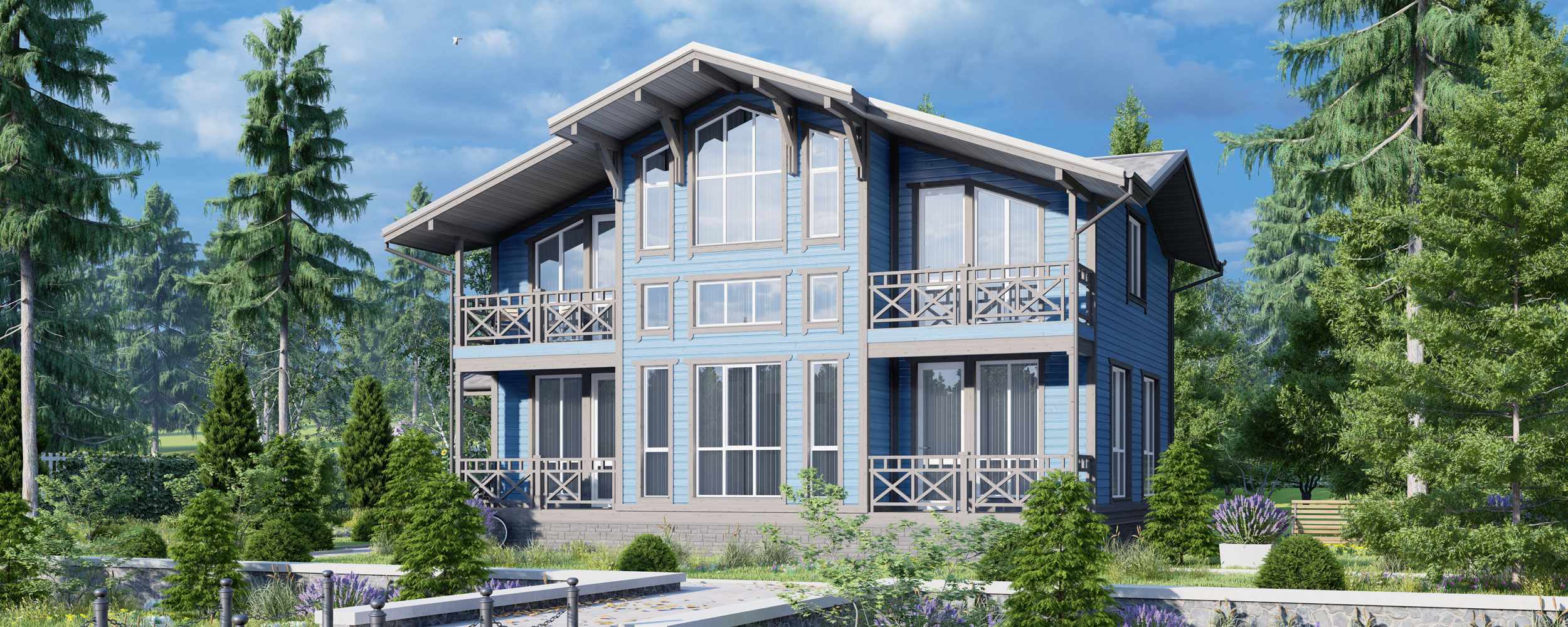 Особенности серии: два балкона на втором этаже и две небольшие террасы. Дополнительно можно пристроить более просторную террасу или патио площадью до 45 кв. м.