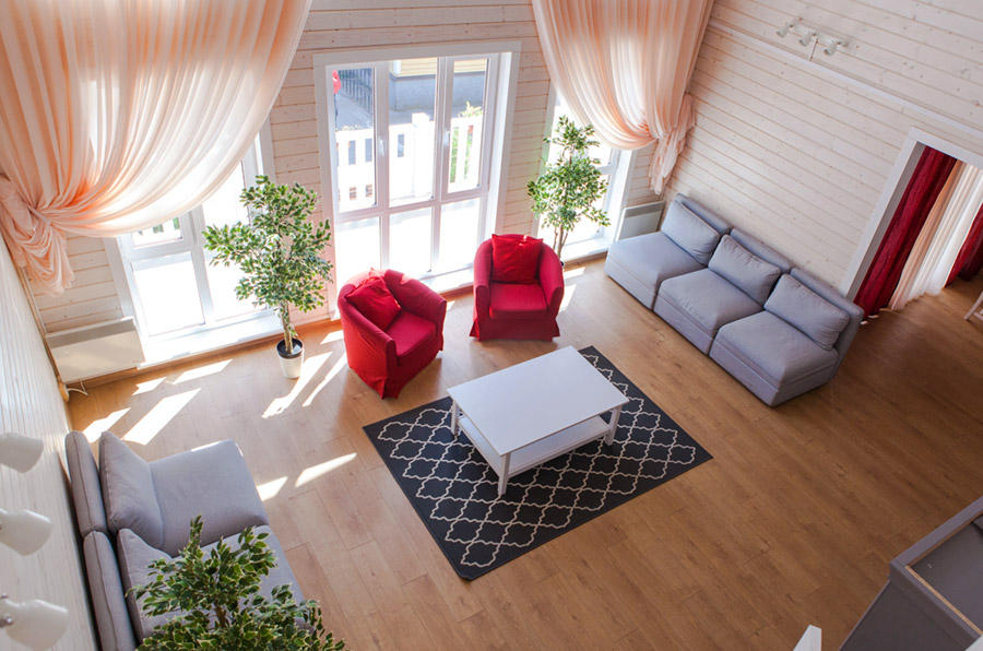 Благодаря панорамным окнам светлая гостиная кажется воздушной. Как и в кухне-столовой, цветовой ансамбль здесь построен на контрастах: светлая отделка и тёмная мебель.