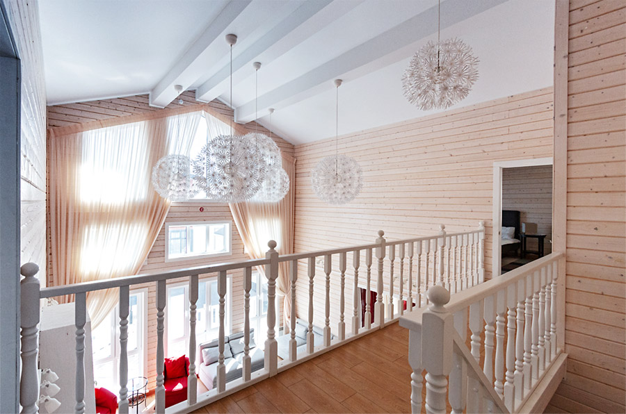 Коттедж можно заказать в варианте со вторым светом: дом станет ещё более просторным, а холл второго этажа превратится в стильный внутренний балкон.