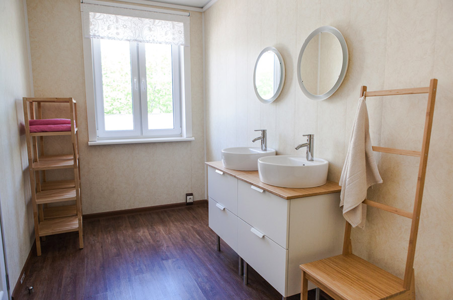 Отделка санузла (1 этаж): влагостойкий виниловый ламинат, стены и потолок - пластиковые панели