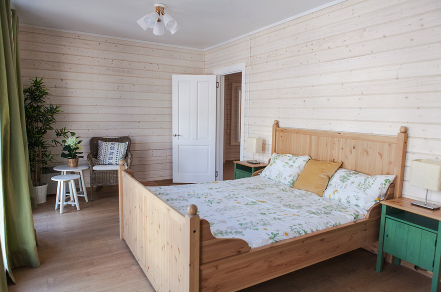 Свайный фундамент и усиленный каркас стен 200 мм, крепко сшитый снаружи плитами ОСП-9, делают дом прочным и долговечным.