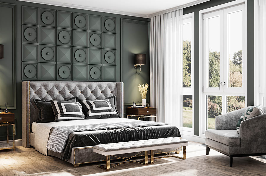 Панорамные окна наполняют комнату светом, а мягкие тёмные тона интерьера помогают создать спокойную и расслабляющую атмосферу.