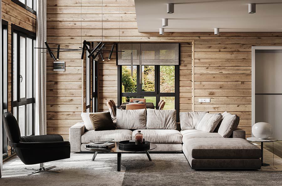 Панорамные окна выходят на широкое патио. Светлый интерьер, минималистичный дизайн и низкая мебель усиливают ощущение воздушности и объёма. А если за окнами красивый сад или пейзаж, гостиная станет местом притяжения для всей семьи.